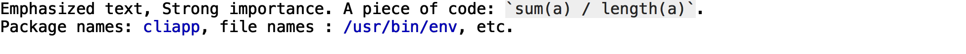 cli_text("{emph Emphasized text}, {strong Strong} importance.A piece of code: {code sum(a) / length(a)}. Package names:{pkg cliapp}, file names: {path /usr/bin/env}, etc.")