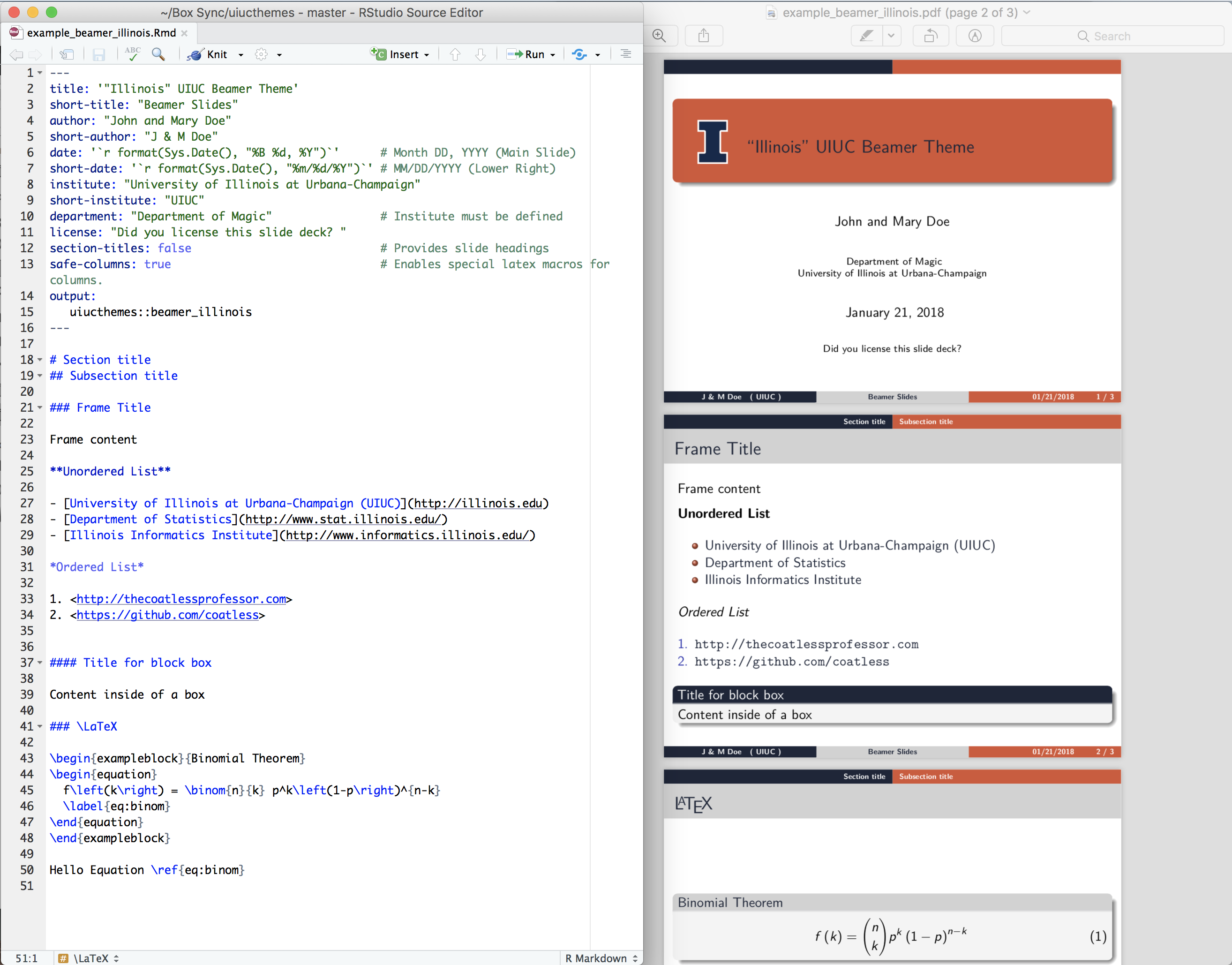 ---title: '"Illinois" UIUC Beamer Theme'short-title: "Beamer Slides"author: "John and Mary Doe"short-author: "J & M Doe"date: 'October 03, 2018' # Month DD, YYYY (Main Slide)short-date: '10/03/2018' # MM/DD/YYYY (Lower Right)institute: "University of Illinois at Urbana-Champaign"short-institute: "UIUC"department: "Department of Magic" # Institute must be definedlicense: "Did you license this slide deck? "section-titles: false # Provides slide headingssafe-columns: true # Enables special latex macros for columns.output:uiucthemes::beamer_illinois---# Section title## Subsection title### Frame TitleFrame content**Unordered List**- [University of Illinois at Urbana-Champaign (UIUC)](http://illinois.edu)- [Department of Statistics](http://www.stat.illinois.edu/)- [Illinois Informatics Institute](http://www.informatics.illinois.edu/)*Ordered List*1. <http://thecoatlessprofessor.com>2. <https://github.com/coatless>#### Title for block boxContent inside of a box### \LaTeX\begin{exampleblock}{Binomial Theorem}\begin{equation}f\left(k\right) = \binom{n}{k} p^k\left(1-p\right)^{n-k}\label{eq:binom}\end{equation}\end{exampleblock}Hello Equation \ref{eq:binom}